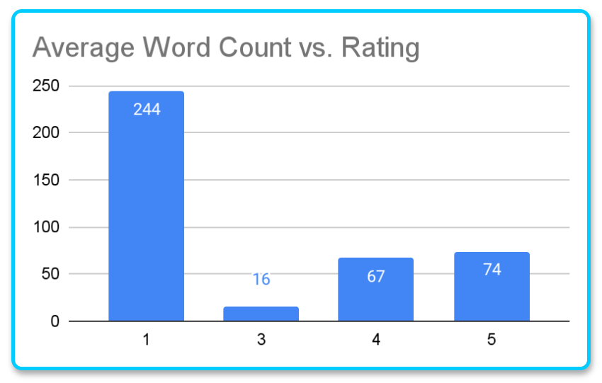 Un reciente estudio muestra la cantidad de palabras media de las reseñas que tienen más visibilidad, con una muestra muy grande de negocios de Google, como puede verse en la imagen:
